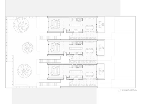 The row houses use CMU block wall construction. Six heavy block walls clad with brick veneer create a unique juxtaposition of heavy and light with the open floor plans and the green houses located between each row house.